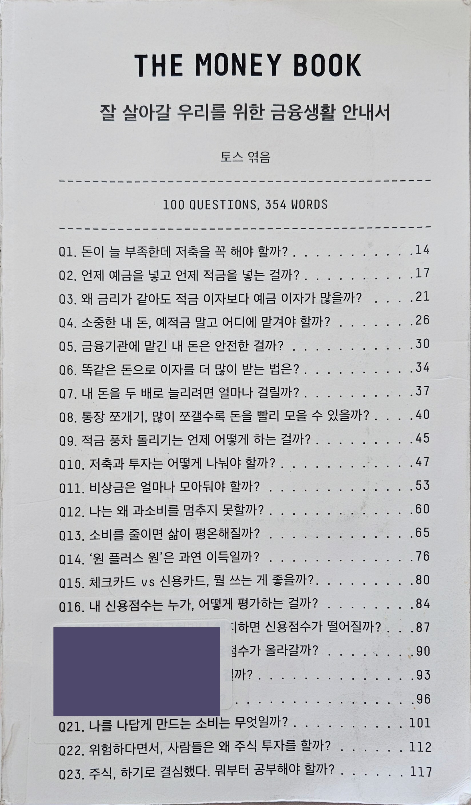 안녕하세요 인디워커입니다오늘은 토스에서 만든'THE MONEY BOOK'이라는 책에 대해포스팅하려고 해요 이 책을 선택한 계기는경제 뉴스, 유튜브, 경제 관련 서적 등경제를 좀 배우고자 했는데용어부터 경제 기본 원리 등기초지식이 없어서 이해조차 하기어렵더라고요 그래서 저 같이 초보자들을 위한기초적인 지식을 설명해주는 책이없을까 찾아보다가'THE MONEY BOOK'이라는 책을발견했어요 토스에서 만든거라 더 신뢰가가기도 했고요ㅎㅎ 사람들이 많이 물어보는100가지 질문에 대해서전문가들이 답변하는 형식인데요 평소에 궁금하던 내용도 많이 있고기본적인 지식도 다루는 책이라경제 입문자들이 접하기 좋더라고요 저축, 소비, 투자, 대출 등에 대해실제 해보지 않으면잘 모르는 내용이지만단어 정의부터 원리까지초보자의 눈..